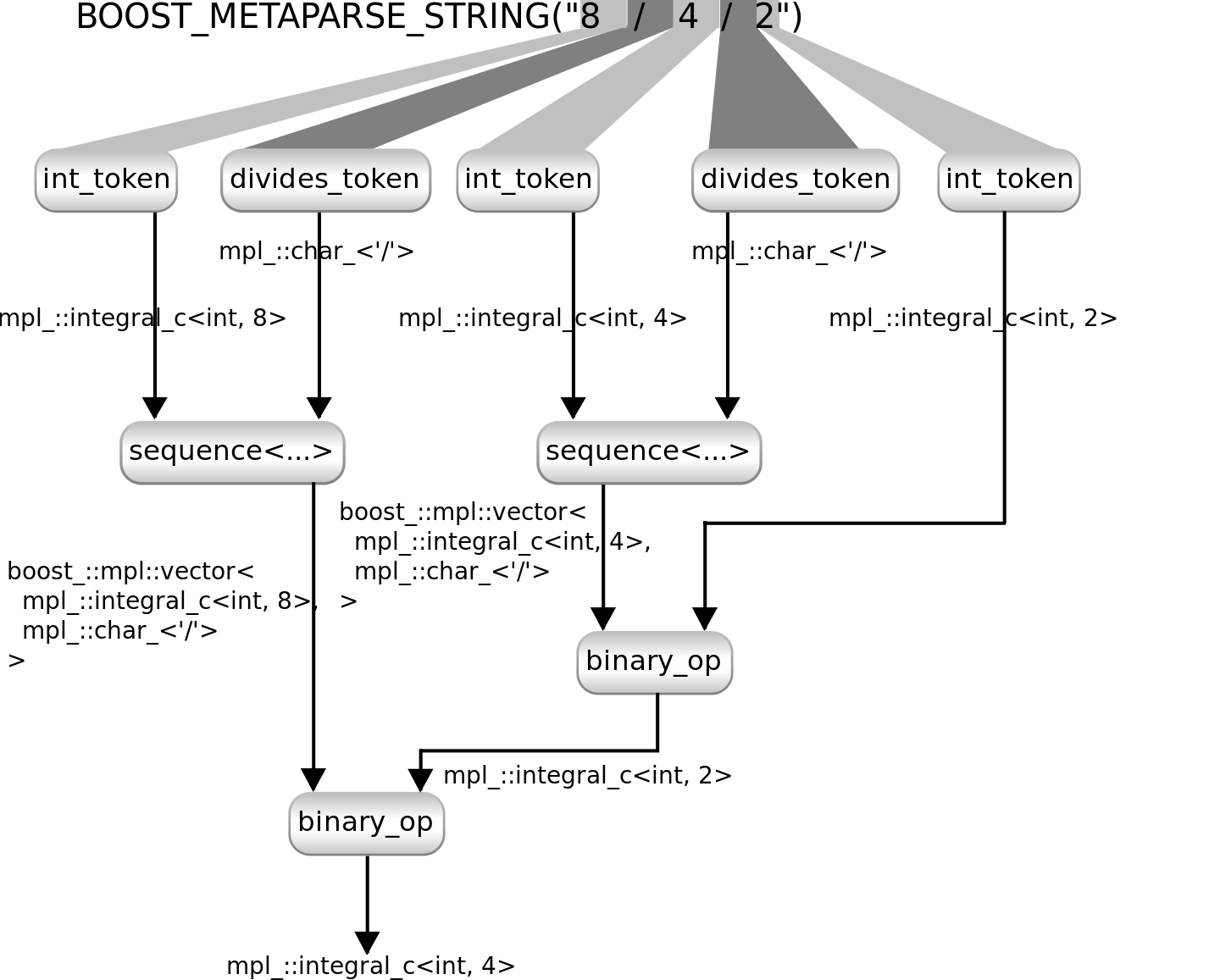 #include <boost/mpl/divides.hpp> template <class L, class R> struct eval_binary_op<L, '/', R> : boost::mpl::divides<L, R>::type {}; using divides_token = token<lit_c<'/'>>; using mult_exp2 = foldl_start_with_parser< sequence<one_of<times_token, divides_token>, int_token>, int_token, boost::mpl::quote2<binary_op> >; using exp_parser16 = build_parser< foldl_start_with_parser< sequence<one_of<plus_token, minus_token>, mult_exp2>, mult_exp2, boost::mpl::quote2<binary_op> > >;