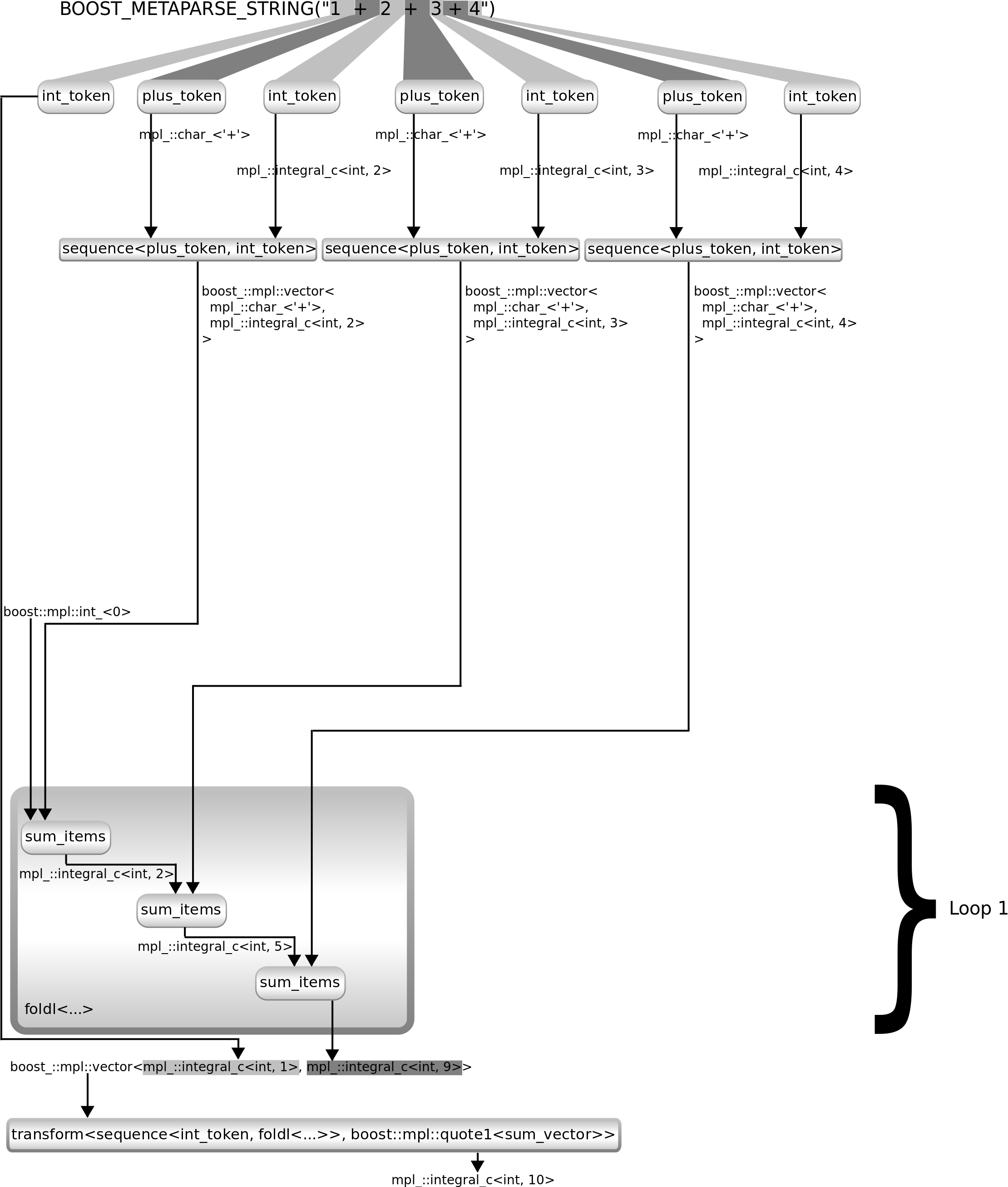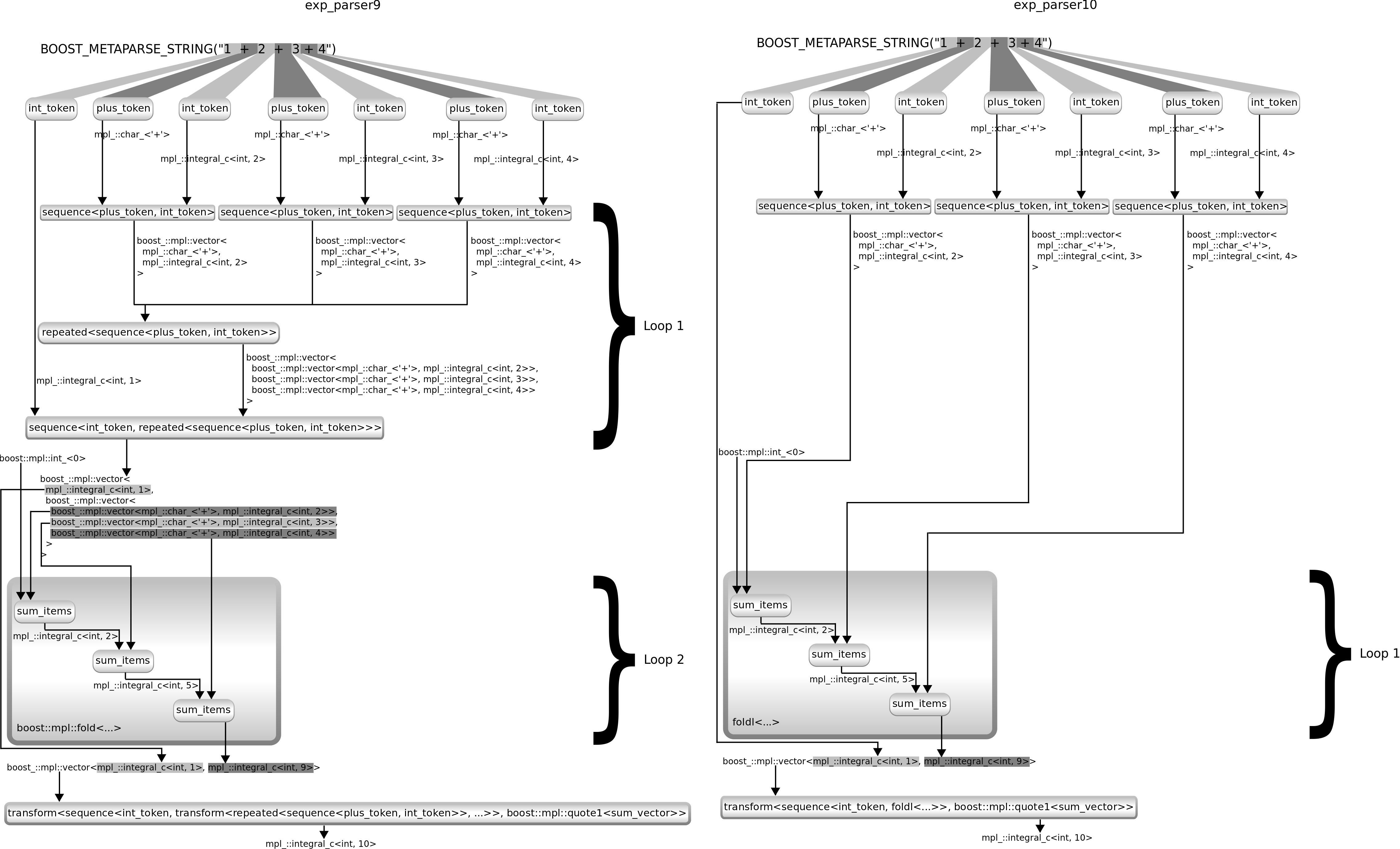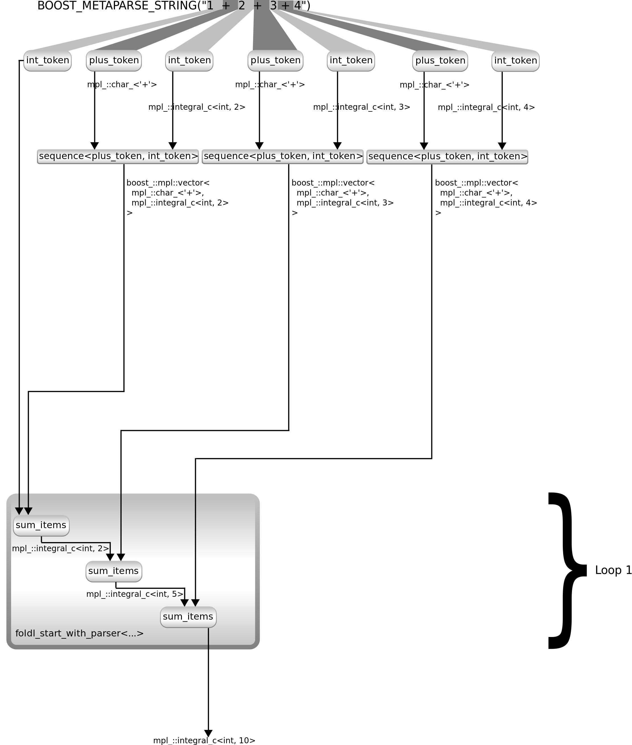using exp_parser9 = build_parser< transform< /* What we had so far */ sequence< int_token, transform< repeated<sequence<plus_token, int_token>>, boost::mpl::lambda< boost::mpl::fold< boost::mpl::_1, boost::mpl::int_<0>, boost::mpl::quote2<sum_items> > >::type > >, boost::mpl::quote1<sum_vector> /* summarise the vector of numbers */ > >;