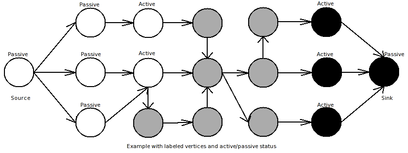 grow-phase: In this phase active vertices are allowed to acquire neighbor vertices that are connected through an edge that has a capacity-value greater than zero. Acquiring means that those vertices become active and belong now to the search tree of the current active vertex. If there are no more valid connections to neighbor vertices, the current vertex becomes passive and the grow phase continues with the next active vertex. The grow phase terminates if there are no more active vertices left or a vertex discovers a vertex from the other search tree through an unsaturated edge. In this case a path from source to sink is found.