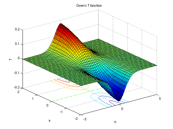 For h and a > 0, T(h,a), gives the volume of an uncorrelated bivariate normal distribution with zero means and unit variances over the area between y = ax and y = 0 and to the right of x = h.