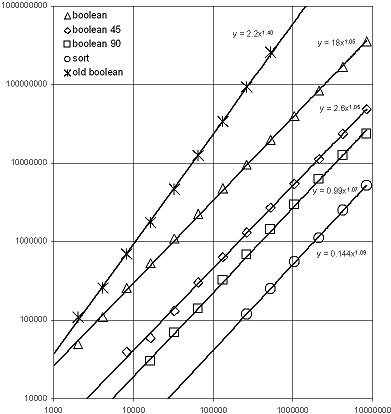 Polygon Set Algorithms AnalysisMost non-trivial algorithms in the Boost.Polygon library are instantiations of generic sweep-line algorithms that provide the capability to perform Manhattan and 45-degree line segment intersection, n-layer map overlay, connectivity graph extraction and clipping/Booleans. These algorithms have O(n log n) runtime complexity for n equal to input vertices plus intersection vertices. The arbitrary angle line segment intersection algorithm is not implemented as a sweep-line due to complications related to achieving numerical robustness. The general line segment intersection algorithm is implemented as an recursive adaptive heuristic divide and conquer in the y dimension followed by sorting line segments in each subdivision by x coordinates and scanning left to right. By one-dimensional decomposition of the problem space in both x and y the algorithm approximates the optimal O(n log n) Bentley-Ottmann line segment intersection runtime complexity in the common case. Specific examples of inputs that defeat one dimensional decomposition of the problem space can result in pathological quadratic runtime complexity to which the Bentley-Ottmann algorithm is immune. Below is shown a log-log plot of runtime versus input size for inputs that increase quadratically in size. The inputs were generated by pseudo-randomly distributing small axis-parallel rectangles within a square area proportional the the number of rectangles specified for each trial. In this way the probability of intersections being produced remains constant as the input size grows. Because intersection vertices are expected to be a constant factor of input vertices we can examine runtime complexity in terms of input vertices. The operation performed was a union (Boolean OR) of the input rectangles by each of the Manhattan, 45-degree and arbitrary angle Booleans algorithms, which are labeled "boolean 90", "boolean 45" and "boolean". Also shown in the plot is the performance of the arbitrary angle Booleans algorithm as prior to the addition of divide and conquer recursive subdivision, which was described in the paper presented at boostcon 2009. Finally, the time required to sort the input points is shown as a common reference for O(n log n) runtime to put the data into context. We can see in the log-log plot that sorting and the three Booleans algorithms provided by the Boost.Polygon library have nearly 45 degree "linear" scaling with empirical exponents just slightly larger than 1.0 and can be observed to scale proportional to O(n log n) for these inputs. The "old boolean" algorithm presented at boostcon 2009 exhibits scaling close to the expected O(n1.5) scaling. Because the speedup provided by the divide and conquer approach is algorithmic, the 10X potential performance improvement alluded to in the paper is realized at inputs of 200,000 rectangles and larger. Even for small inputs of 2K rectangles the algorithm is 2X faster and now can be expected to be roughly as fast as GPC at small scales, while algorithmically faster at large scales. From the plot we can compare the constant factor performance of the various Booleans algorithms with the runtime of std::sort as a baseline for O(n log n) algorithms. If you consider sort to be one unit of O(n log n) algorithmic work we can see that Manhattan Booleans cost roughly five units of O(n log n) work, 45-degree Booleans cost roughly ten units of O(n log n) work and arbitrary angle Booleans cost roughly seventy units of O(n log n) work. Sorting the input vertices is the first step in a Booleans algorithm and therefore provides a hard lower bound for the runtime of an optimal Booleans algorithm. One final thing to note about performance of the arbitrary angle Booleans algorithm is that the use of GMP infinite precision rational data type for numerically robust computations can be employed by including boost/polygon/gmp_override.hpp and linking to lgmpxx and lgmp. This provides 100% assurance that the algorithm will succeed and produce an output snapped to the integer grid with a minimum of one integer grid of error on polygon boundaries upon which intersection points are introduced. However, the infinite precision data type is never used for predicates (see the boostcon presentation or paper for description of robust predicates) and is only used for constructions of intersection coordinate values in the very rare case that long double computation of the intersection of two line segments fails to produce an intersection point within one integer unit of both line segments. This means that there is effectively no runtime penalty for the use of infinite precision to ensure 100% robustness. Most inputs will process through the algorithm without ever resorting to GMP. |