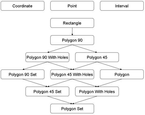 The Polygon library uses C++-Concepts inspired template programming to provide generic library functions overloaded on concept type. There are currently thirteen concepts in the Polygon library type system. A concept object in the Polygon library is just an empty struct similar to a tag that would be used for tag dispatching. These concepts are shown in the refinement diagram below.