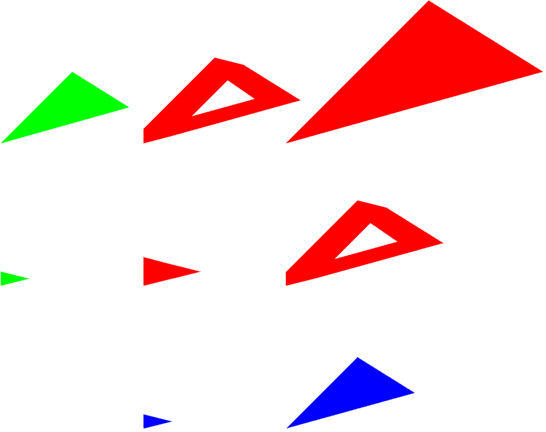 In each of these examples the origin of the coordinate system is in the lower left corner of the image and the sum of the x and y locations of the input polygons places the result in the upper right hand corner of the images. In the example above the lower left red triangle is the convolution of the small blue triangle with the small green triangle. The upper right red triangle is the convolution of the large blue and large green triangle. The two medium sized red polygons are the result of the convolution of the small with large and large with small blue and green triangles. The test case was carefully contrived to prevent the result from merging together, though that could certainly happen.