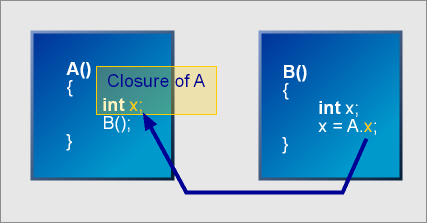 The following diagram depicts the situation where a function A (or rule) exposes its closure and another function B references A's variables through its closure.
