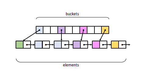 any number of elements. For example, the following diagram shows a boost::unordered_set with 7 buckets containing 5 elements, A,